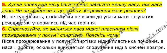 Купка попелу на місці багаття має набагато меншу масу, ніж маса дров. Чи не суперечить це закону збереження маси речовин? Ні, не суперечить, оскільки ми не взяли до уваги маси газуватих речовин, які утворились під час горіння. 6. Спрогнозуйте, як зміниться маса мідної пластинки після прожарювання у полум'ї спиртівки. Поясніть чому. Після прожарювання у полум’ї спиртівки мідна пластинка почорніє, а маса її зросте, оскільки відбудеться сполучення міді з киснем повітря.