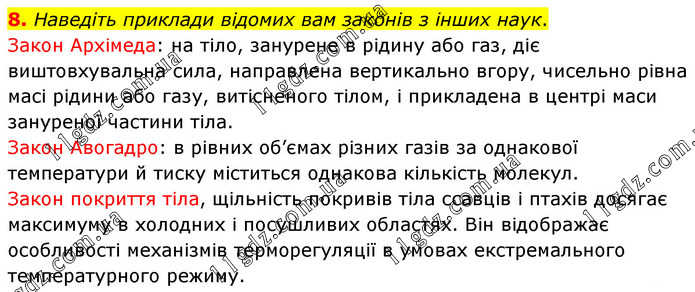 Наведіть приклади відомих вам законів з інших наук. Закон Архімеда: на тіло, занурене в рідину або газ, діє виштовхувальна сила, направлена вертикально вгору, чисельно рівна масі рідини або газу, витісненого тілом, і прикладена в центрі маси зануреної частини тіла. Закон Авогадро: в рівних об’ємах різних газів за однакової температури й тиску міститься однакова кількість молекул. Закон покриття тіла, щільність покривів тіла ссавців і птахів досягає максимуму в холодних і посушливих областях. Він відображає особливості механізмів терморегуляції в умовах екстремального температурного режиму.