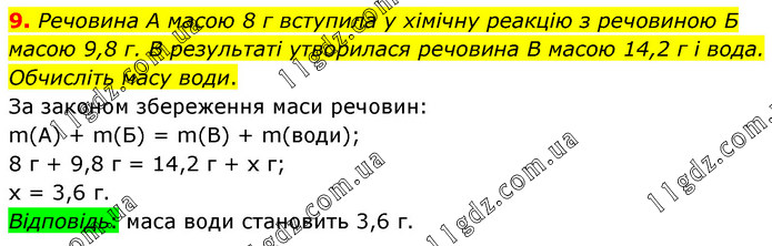 Речовина А масою 8 г вступила у хімічну реакцію з речовиною Б масою 9,8 г. В результаті утворилася речовина В масою 14,2 г і вода. Обчисліть масу води. За законом збереження маси речовин: m(А) + m(Б) = m(В) + m(води); 8 г + 9,8 г = 14,2 г + х г; х = 3,6 г. Відповідь: маса води становить 3,6 г.