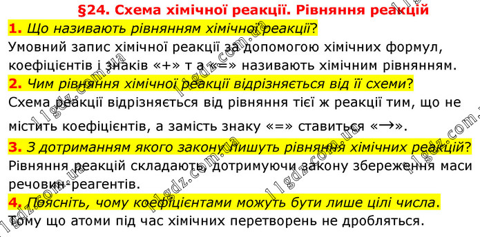 §24. Схема хімічної реакції. Рівняння реакцій 1. Що називають рівнянням хімічної реакції? Умовний запис хімічної реакції за допомогою хімічних формул, коефіцієнтів і знаків «+» т а «=» називають хімічним рівнянням. 2. Чим рівняння хімічної реакції відрізняється від її схеми? Схема реакції відрізняється від рівняння тієї ж реакції тим, що не містить коефіцієнтів, а замість знаку «=» ставиться «→». 3. З дотриманням якого закону пишуть рівняння хімічних реакцій? Рівняння реакцій складають, дотримуючи закону збереження маси речовин-реагентів. 4. Поясніть, чому коефіцієнтами можуть бути лише цілі числа. Тому що атоми під час хімічних перетворень не дробляться.