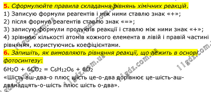Сформулюйте правила складання рівнянь хімічних реакцій. 1) Записую формули реагентів і між ними ставлю знак «+»; 2) після формул реагентів ставлю знак «=»; 3) записую формули продуктів реакції і ставлю між ними знак «+»; 4) зрівнюю кількості атомів кожного елемента в лівій і правій частині рівняння, користуючись коефіцієнтами. 6. Запишіть, як вимовляють рівняння реакції, що лежить в основі фотосинтезу: 6H2O + 6CO2 = C6H12O6 + 6O2 «Шість аш-два-о плюс шість це-о-два дорівнює це-шість-аш-дванадцять-о-шість плюс шість о-два».