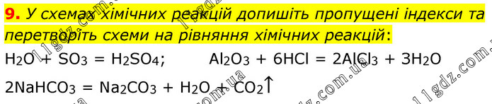У схемах хімічних реакцій допишіть пропущені індекси та перетворіть схеми на рівняння хімічних реакцій: Н2O + SO3 = Н2SO4; Аl2O3 + 6НСl = 2АlСl3 + ЗН2O 2NаНСO3 = Na2CO3 + Н2O + СO2↑