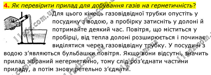 Як перевірити прилад для добування газів на герметичність? Для цього кінець газовідвідної трубки опустіть у посудину з водою, а пробірку затисніть у долоні й потримайте деякий час. Повітря, що міститься у пробірці, від тепла долоні розширюється і починає виділятися через газовідвідну трубку. У посудині з водою з’являються бульбашки повітря. Якщо вони відсутні, значить прилад зібраний негерметично, тому слід роз’єднати частини приладу, а потім знову ретельно з’єднати.