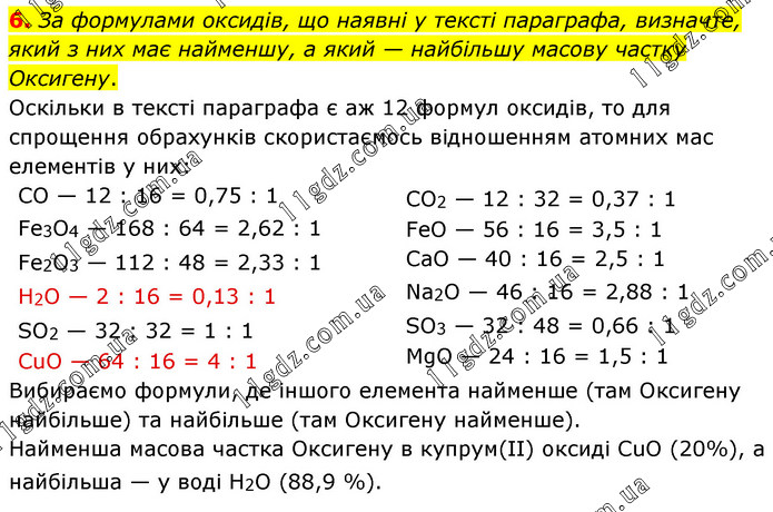 За формулами оксидів, що наявні у тексті параграфа, визначте, який з них має найменшу, а який — найбільшу масову частку Оксигену. Оскільки в тексті параграфа є аж 12 формул оксидів, то для спрощення обрахунків скористаємось відношенням атомних мас елементів у них: СО — 12 : 16 = 0,75 : 1 Fе3O4 — 168 : 64 = 2,62 : 1 Fе2O3 — 112 : 48 = 2,33 : 1 Н2O — 2 : 16 = 0,13 : 1 SO2 — 32 : 32 = 1 : 1 СuО — 64 : 16 = 4 : 1 СO2 — 12 : 32 = 0,37 : 1 FеО — 56 : 16 = 3,5 : 1 СаО — 40 : 16 = 2,5 : 1 Nа2O — 46 : 16 = 2,88 : 1 SO3 — 32 : 48 = 0,66 : 1 MgО — 24 : 16 = 1,5 : 1 Вибираємо формули, де іншого елемента найменше (там Оксигену найбільше) та найбільше (там Оксигену найменше). Найменша масова частка Оксигену в купрум(ІІ) оксиді СuО (20%), а найбільша — у воді Н2O (88,9 %).