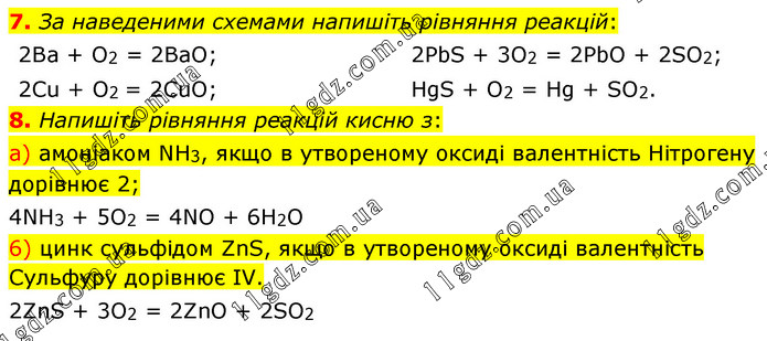 За наведеними схемами напишіть рівняння реакцій: 2Ba + O2 = 2BaO; 2Cu + O2 = 2CuO; 2PbS + 3O2 = 2PbO + 2SO2; HgS + O2 = Hg + SO2. 8. Напишіть рівняння реакцій кисню з: а) амоніаком NН3, якщо в утвореному оксиді валентність Нітрогену дорівнює 2; 4NH3 + 5O2 = 4NO + 6H2O 6) цинк сульфідом ZnS, якщо в утвореному оксиді валентність Сульфуру дорівнює IV. 2ZnS + 3O2 = 2ZnO + 2SO2