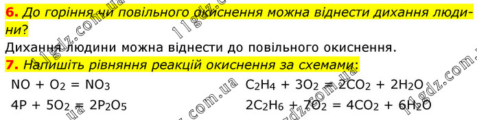 До горіння чи повільного окиснення можна віднести дихання люди ни? Дихання людини можна віднести до повільного окиснення. 7. Напишіть рівняння реакцій окиснення за схемами: NO + O2 = NO3 4P + 5O2 = 2P2O5 C2H4 + 3O2 = 2CO2 + 2H2O 2C2H6 + 7O2 = 4CO2 + 6H2O