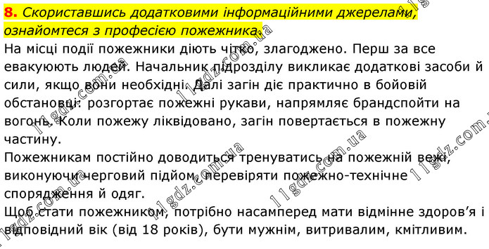 Скориставшись додатковими інформаційними джерелами, ознайомтеся з професією пожежника. На місці події пожежники діють чітко, злагоджено. Перш за все евакуюють людей. Начальник підрозділу викликає додаткові засоби й сили, якщо вони необхідні. Далі загін діє практично в бойовій обстановці: розгортає пожежні рукави, напрямляє брандспойти на вогонь. Коли пожежу ліквідовано, загін повертається в пожежну частину. Пожежникам постійно доводиться тренуватись на пожежній вежі, виконуючи черговий підйом, перевіряти пожежно-технічне спорядження й одяг. Щоб стати пожежником, потрібно насамперед мати відмінне здоров’я і відповідний вік (від 18 років), бути мужнім, витривалим, кмітливим.