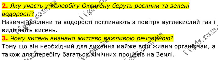Яку участь у колообігу Оксигену беруть рослини та зелені водорості? Наземні рослини та водорості поглинають з повітря вуглекислий газ і виділяють кисень. 3. Чому кисень визнано життєво важливою речовиною? Тому що він необхідний для дихання майже всім живим організмам, а також для перебігу багатьох хімічних процесів на Землі.