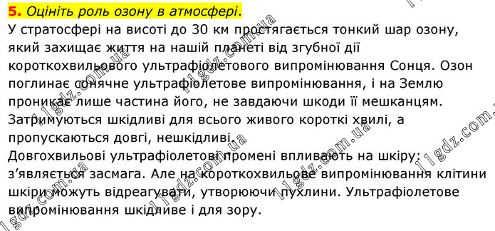 Оцініть роль озону в атмосфері. У стратосфері на висоті до 30 км простягається тонкий шар озону, який захищає життя на нашій планеті від згубної дії короткохвильового ультрафіолетового випромінювання Сонця. Озон поглинає сонячне ультрафіолетове випромінювання, і на Землю проникає лише частина його, не завдаючи шкоди її мешканцям. Затримуються шкідливі для всього живого короткі хвилі, а пропускаються довгі, нешкідливі. Довгохвильові ультрафіолетові промені впливають на шкіру: з’являється засмага. Але на короткохвильове випромінювання клітини шкіри можуть відреагувати, утворюючи пухлини. Ультрафіолетове випромінювання шкідливе і для зору.