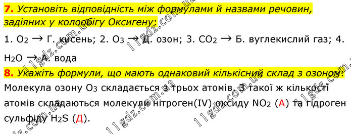 Установіть відповідність між формулами й назвами речовин, задіяних у колообігу Оксигену: 1. О2 → Г. кисень; 2. О3 → Д. озон; 3. СО2 → Б. вуглекислий газ; 4. Н2О → А. вода 8. Укажіть формули, що мають однаковий кількісний склад з озоном: Молекула озону О3 складається з трьох атомів. З такої ж кількості атомів складаються молекули нітроген(ІV) оксиду NO2 (А) та гідроген сульфіду Н2S (Д).
