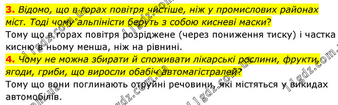 Відомо, що в горах повітря чистіше, ніж у промислових районах міст. Тоді чому альпіністи беруть з собою кисневі маски? Тому що в горах повітря розріджене (через пониження тиску) і частка кисню в ньому менша, ніж на рівнині. 4. Чому не можна збирати й споживати лікарські рослини, фрукти, ягоди, гриби, що виросли обабіч автомагістралей? Тому що вони поглинають отруйні речовини, які містяться у викидах автомобілів.