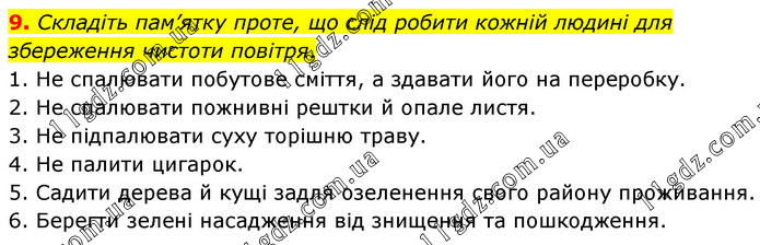 Складіть пам’ятку проте, що слід робити кожній людині для збереження чистоти повітря. 1. Не спалювати побутове сміття, а здавати його на переробку. 2. Не спалювати пожнивні рештки й опале листя. 3. Не підпалювати суху торішню траву. 4. Не палити цигарок. 5. Садити дерева й кущі задля озеленення свого району проживання. 6. Берегти зелені насадження від знищення та пошкодження.