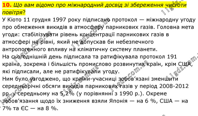 Що вам відомо про міжнародний досвід зі збереження чистоти повітря? У Кіото 11 грудня 1997 року підписано протокол — міжнародну угоду про обмеження викидів в атмосферу парникових газів. Головна мета угоди: стабілізувати рівень концентрації парникових газів в атмосфері на рівні, який не допускав би небезпечного антропогенного впливу на кліматичну систему планети. На сьогоднішній день підписала та ратифікувала протокол 191 країна, зокрема і більшість промислово розвинутих країн, крім США, які підписали, але не ратифікували угоду. Ним було узгоджено, що країни-учасниці зобов’язані зменшити середньорічні обсяги викидів парникових газів у період 2008-2012 рр. у середньому на 5,2% (у порівнянні з 1990 р.). Окреме зобов’язання щодо їх зниження взяли Японія — на 6 %, США — на 7% та ЄС — на 8 %.
