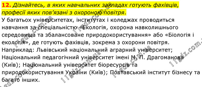 Дізнайтесь, в яких навчальних закладах готують фахівців, професії яких пов’язані з охороною повітря. У багатьох університетах, інститутах і коледжах проводиться навчання за спеціальністю «Екологія, охорона навколишнього середовища та збалансоване природокористування» або «Біологія і екологія», де готують фахівців, зокрема з охорони повітря. Наприклад: Львівський національний аграрний університет; Національний педагогічний університет імені М. П. Драгоманова (Київ); Національний університет біоресурсів та природокористування України (Київ); Полтавський інститут бізнесу та багато інших.