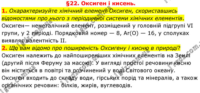§22. Оксиген і кисень. 1. Охарактеризуйте хімічний елемент Оксиген, скориставшись відомостями про нього з періодичної системи хімічних елементів. Оксиген— неметалічний елемент, розміщений у головній підгрупі VI групи, у 2 періоді. Порядковий номер — 8, Аr(O) — 16, у сполуках виявляє валентність II. 2. Що вам відомо про поширеність Охсигену і кисню в природі? Оксиген належить до найпоширеніших хімічних елементів на Землі (другий після Феруму за масою). У вигляді простої речовини кисню він міститься в повітрі та розчинений у воді Світового океану. Оксиген входить до складу води, гірських порід та мінералів, а також органічних речовин: білків, жирів, вуглеводів.