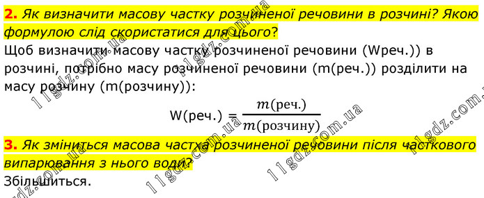 Як визначити масову частку розчиненої речовини в розчині? Якою формулою слід скористатися для цього? Щоб визначити масову частку розчиненої речовини (Wреч.)) в розчині, потрібно масу розчиненої речовини (m(реч.)) розділити на масу розчину (m(розчину)): W(реч.) = (m(реч.))/(m(розчину)) 3. Як зміниться масова частха розчиненої речовини після часткового випарювання з нього води? Збільшиться.