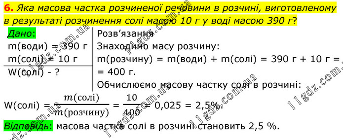 Яка масова частка розчиненої речовини в розчині, виготовленому в результаті розчинення солі масою 10 г у воді масою 390 г? Розв’язання Знаходимо масу розчину: m(розчину) = m(води) + m(солі) = 390 г + 10 г = = 400 г. Обчислюємо масову частку солі в розчині: W(солі) = (m(солі))/(m(розчину)) = 10/400 = 0,025 = 2,5%. Відповідь: масова частка солі в розчині становить 2,5 %.