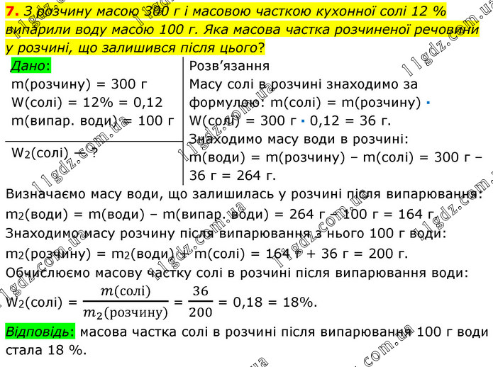 З розчину масою 300 г і масовою часткою кухонної солі 12 % випарили воду масою 100 г. Яка масова частка розчиненої речовини у розчині, що залишився після цього? Розв’язання Масу солі в розчині знаходимо за формулою: m(солі) = m(розчину) ∙ W(солї) = 300 г ∙ 0,12 = 36 г. Знаходимо масу води в розчині: m(води) = m(розчину) – m(солі) = 300 г – 36 г = 264 г. Визначаємо масу води, що залишилась у розчині після випарювання: m2(води) = m(води) – m(випар. води) = 264 г – 100 г = 164 г. Знаходимо масу розчину після випарювання з нього 100 г води: m2(розчину) = m2(води) + m(солі) = 164 г + 36 г = 200 г. Обчислюємо масову частку солі в розчині після випарювання води: W2(солі) = (m(солі))/(m_2 (розчину)) = 36/200 = 0,18 = 18%. Відповідь: масова частка солі в розчині після випарювання 100 г води стала 18 %.