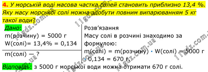 У морській воді масова частка солей становить приблизно 13,4 %. Яку масу морської солі можна здобути повним випарюванням 5 кг такої води? Розв’язання Масу солі в розчині знаходимо за формулою: m(солі) = m(розчину) ∙ W(солі) = 5000 г ∙ 0,134 = 670 г. Відповідь: з 5000 г морської води можна отримати 670 г солі.