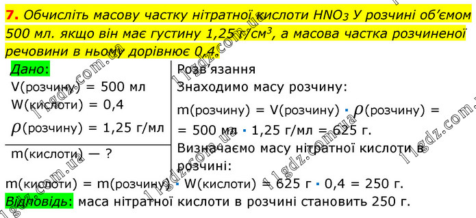 Обчисліть масову частку нітратної кислоти НNО3 У розчині об’ємом 500 мл. якщо він має густину 1,25 г/см3, а масова частка розчиненої речовини в ньому дорівнює 0,4. Розв’язання Знаходимо масу розчину: m(розчину) = V(розчину) ∙ ρ(розчину) = = 500 мл ∙ 1,25 г/мл = 625 г. Визначаємо масу нітратної кислоти в розчині: m(кислоти) = m(розчину) ∙ W(кислоти) = 625 г ∙ 0,4 = 250 г. Відповідь: маса нітратної кислоти в розчині становить 250 г.