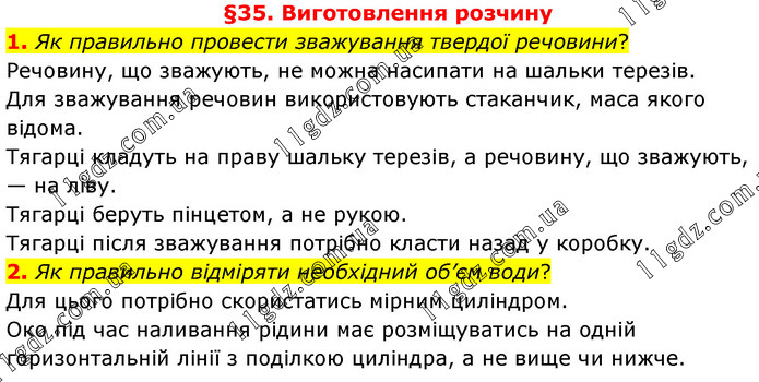 §35. Виготовлення розчину 1. Як правильно провести зважування твердої речовини? Речовину, що зважують, не можна насипати на шальки терезів. Для зважування речовин використовують стаканчик, маса якого відома. Тягарці кладуть на праву шальку терезів, а речовину, що зважують, — на ліву. Тягарці беруть пінцетом, а не рукою. Тягарці після зважування потрібно класти назад у коробку. 2. Як правильно відміряти необхідний об’єм води? Для цього потрібно скористатись мірним циліндром. Око під час наливання рідини має розміщуватись на одній горизонтальній лінії з поділкою циліндра, а не вище чи нижче.