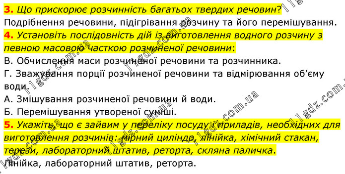 Що прискорює розчинність багатьох твердих речовин? Подрібнення речовини, підігрівання розчину та його перемішування. 4. Установіть послідовність дій із виготовлення водного розчину з певною масовою часткою розчиненої речовини: В. Обчислення маси розчиненої речовини та розчинника. Г. Зважування порції розчиненої речовини та відмірювання об’єму води. А. Змішування розчиненої речовини й води. Б. Перемішування утвореної суміші. 5. Укажіть, що є зайвим у переліку посуду і приладів, необхідних для виготовлення розчинів: мірний циліндр, лінійка, хімічний стакан, терези, лабораторний штатив, реторта, скляна паличка. Лінійка, лабораторний штатив, реторта.