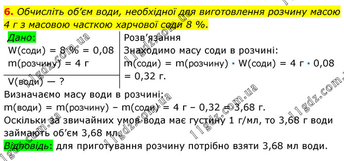 Обчисліть об’єм води, необхідної для виготовлення розчину масою 4 г з масовою часткою харчової соди 8 %. Розв’язання Знаходимо масу соди в розчині: m(соди) = m(розчину) ∙ W(соди) = 4 г ∙ 0,08 = 0,32 г. Визначаємо масу води в розчині: m(води) = m(розчину) – m(соди) = 4 г – 0,32 = 3,68 г. Оскільки за звичайних умов вода має густину 1 г/мл, то 3,68 г води займають об’єм 3,68 мл. Відповідь: для приготування розчину потрібно взяти 3,68 мл води.