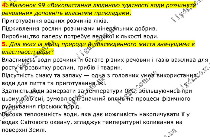 Малюнок 99 «Використання людиною здатності води розчиняти речовини» доповніть власними прикладами. Приготування водних розчинів ліків. Підживлення рослин розчинами мінеральних добрив. Виробництво паперу потребує великої кількості води. 5. Для яких із явищ природи й повсякденного життя значущими є властивості води? Властивість води розчиняти багато різних речовин і газів важлива для росту й розвитку рослин, грибів і тварин. Відсутність смаку та запаху — одна з головних умов використання води для пиття та приготування їжі. Здатність води замерзати за температури 0°С, збільшуючись при цьому в об’ємі, зумовлює її значний вплив на процеси фізичного руйнування гірських порід. Висока теплоємність води, яка дає можливість накопичувати її у водах Світового океану, згладжує температурні коливання на поверхні Землі.
