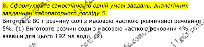 Сформулюйте самостійно по одній умові завдань, аналогічних завданням лабораторного досліду 5. Виготовте 80 г розчину солі з масовою часткою розчиненої речовини 5%. (1) Виготовте розчин соди з масовою часткою речовини 4%, взявши для цього 192 мл води. (2)