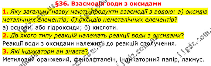§36. Взаємодія води з оксидами 1. Яку загальну назву мають продукти взаємодії з водою: а) оксидів металічних елементів; б) оксидів неметалічних елементів? а) основи, або гідроксиди; б) кислоти. 2. До якого типу реакцій належать реакції води з оксидами? Реакції води з оксидами належить до реакцій сполучення. 3. Які індикатори ви знаєте? Метиловий оранжевий, фенолфталеїн, індикаторний папір, лакмус.