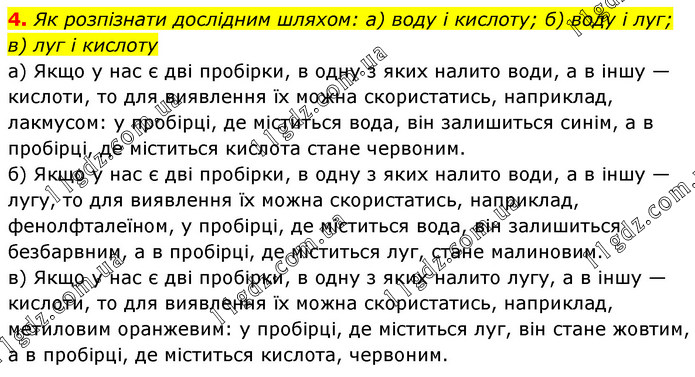Як розпізнати дослідним шляхом: а) воду і кислоту; б) воду і луг; в) луг і кислоту а) Якщо у нас є дві пробірки, в одну з яких налито води, а в іншу — кислоти, то для виявлення їх можна скористатись, наприклад, лакмусом: у пробірці, де міститься вода, він залишиться синім, а в пробірці, де міститься кислота стане червоним. б) Якщо у нас є дві пробірки, в одну з яких налито води, а в іншу — лугу, то для виявлення їх можна скористатись, наприклад, фенолфталеїном, у пробірці, де міститься вода, він залишиться безбарвним, а в пробірці, де міститься луг, стане малиновим. в) Якщо у нас є дві пробірки, в одну з яких налито лугу, а в іншу — кислоти, то для виявлення їх можна скористатись, наприклад, метиловим оранжевим: у пробірці, де міститься луг, він стане жовтим, а в пробірці, де міститься кислота, червоним.