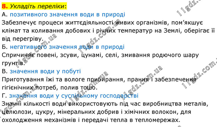 Укладіть переліки: А. позитивного значення води в природі Забезпечує процеси життєдіяльності живих організмів, пом’якшує клімат та коливання добових і річних температур на Землі, оберігає її від перегріву. Б. негативного значення води в природі Спричиняє повені, зсуви, цунамі, селі, змивання родючого шару грунтів. В. значення води у побуті Приготування їжі та вологе прибирання, прання і забезпечення гігієнічних потреб, полив тошо. Г. значення води у суспільному господарстві Значні кількості води використовують під час виробництва металів, целюлози, цукру, мінеральних добрив і хімічних волокон, для охолодження механізмів і передачі тепла в тепломережах.