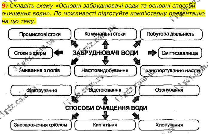 Складіть схему «Основні забруднювачі води та основні способи очищення води». По можливості підготуйте комп'ютерну презентацію на цю тему.
