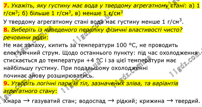 Укажіть, яку густину має вода у твердому агрегатному стані: а) 1 г/см3; б) більше 1 г/см3, в) менше 1 г/см3 У твердому агрегатному стані вода має густину менше 1 г/см3. 8. Виберіть із наведеного переліку фізичні властивості чисто? речовини води: Не має запаху, кипить за температури 100 °С, не проводить електричний струм. Щодо останнього пункту: під час охолодження стискається до температури +4 °С і за цієї температури має найбільшу густину. При подальшому охолодженні починає знову розширюватись. 9. Утворіть логічні пари із тіл, зазначених зліва, та варіантів агрегатного стану: Хмара → газуватий стан; водоспад → рідкий; крижина → твердий.
