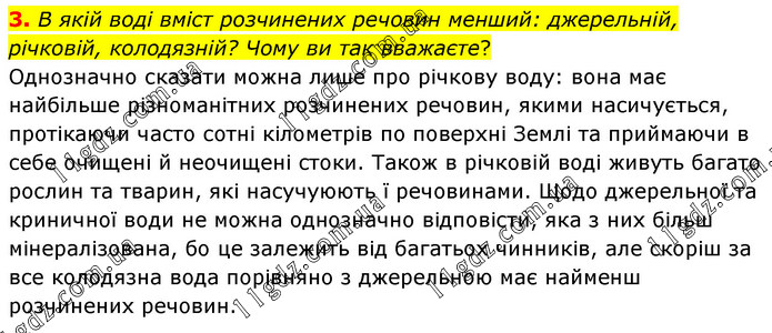 В якій воді вміст розчинених речовин менший: джерельній, річковій, колодязній? Чому ви так вважаєте? Однозначно сказати можна лише про річкову воду: вона має найбільше різноманітних розчинених речовин, якими насичується, протікаючи часто сотні кілометрів по поверхні Землі та приймаючи в себе очищені й неочищені стоки. Також в річковій воді живуть багато рослин та тварин, які насучуюють ї речовинами. Щодо джерельної та криничної води не можна однозначно відповісти, яка з них більш мінералізована, бо це залежить від багатьох чинників, але скоріш за все колодязна вода порівняно з джерельною має найменш розчинених речовин.