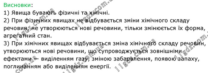 Висновки: 1) Явища бувають фізичні та хімічні. 2) При фізичних явищах не відбувається зміни хімічного складу речовин, не утворюються нові речовини, тільки змінюється їх форма, агрегатний стан. 3) При хімічних явищах відбувається зміна хімічного складу речовин, утворюються нові речовини, що супроводжується зовнішніми ефектами — виділенням газу, зміною забарвлення, появою запаху, поглинанням або виділенням енергії.