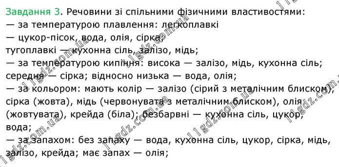 Завдання 3. Речовини зі спільними фізичними властивостями: — за температурою плавлення: легкоплавкі — цукор-пісок, вода, олія, сірка; тугоплавкі — кухонна сіль, залізо, мідь; — за температурою кипіння: висока — залізо, мідь, кухонна сіль; середня — сірка; відносно низька — вода, олія; — за кольором: мають колір — залізо (сірий з металічним блиском), сірка (жовта), мідь (червонувата з металічним блиском), олія (жовтувата), крейда (біла); безбарвні — кухонна сіль, цукор, вода; — за запахом: без запаху — вода, кухонна сіль, цукор, сірка, мідь, залізо, крейда; має запах — олія;