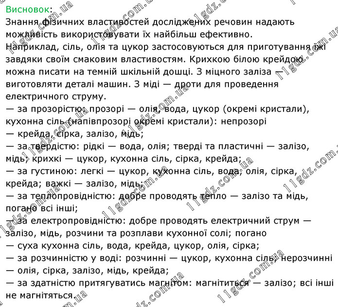 Висновок: Знання фізичних властивостей досліджених речовин надають можливість використовувати їх найбільш ефективно. Наприклад, сіль, олія та цукор застосовуються для приготування їжі завдяки своїм смаковим властивостям. Крихкою білою крейдою можна писати на темній шкільній дошці. З міцного заліза — виготовляти деталі машин. З міді — дроти для проведення електричного струму. — за прозорістю: прозорі — олія, вода, цукор (окремі кристали), кухонна сіль (напівпрозорі окремі кристали): непрозорі — крейда, сірка, залізо, мідь; — за твердістю: рідкі — вода, олія; тверді та пластичні — залізо, мідь; крихкі — цукор, кухонна сіль, сірка, крейда; — за густиною: легкі — цукор, кухонна сіль, вода, олія, сірка, крейда; важкі — залізо, мідь; — за теплопровідністю: добре проводять тепло — залізо та мідь, погано всі інші; — за електропровідністю: добре проводять електричний струм — залізо, мідь, розчини та розплави кухонної солі; погано — суха кухонна сіль, вода, крейда, цукор, олія, сірка; — за розчинністю у воді: розчинні — цукор, кухонна сіль; нерозчинні — олія, сірка, залізо, мідь, крейда; — за здатністю притягуватись магнітом: магнітиться — залізо; всі інші не магнітяться.
