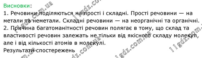 Висновки: 1. Речовини поділяються на прості і складні. Прості речовини — на метали та неметали. Складні речовини — на неорганічні та органічні. 2. Причина багатоманітності речовин полягає в тому, що склад та властивості речовин залежать не тільки від якісного складу молекул, але і від кількості атомів в молекулі. Результати спостережень