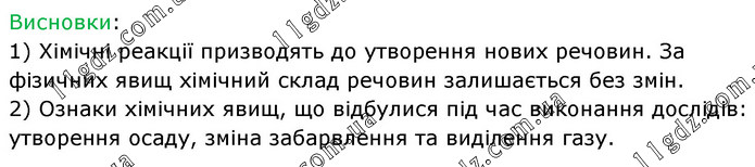 Висновки: 1) Хімічні реакції призводять до утворення нових речовин. За фізичних явищ хімічний склад речовин залишається без змін. 2) Ознаки хімічних явищ, що відбулися під час виконання дослідів: утворення осаду, зміна забарвлення та виділення газу.