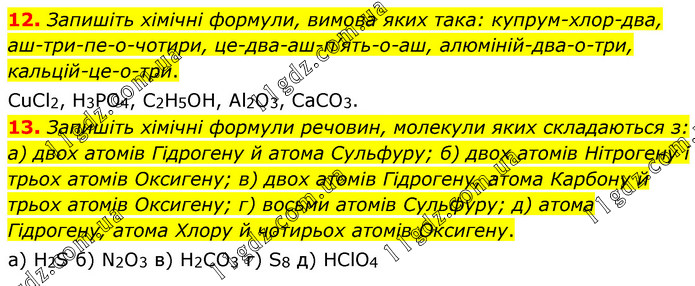 12. Запишіть хімічні формули, вимова яких така: купрум-хлор-два, аш-три-пе-о-чотири, це-два-аш-п’ять-о-аш, алюміній-два-о-три, кальцій-це-о-три. CuCl2, H3PO4, С2Н5ОН, Аl2O3, СаСО3. 13. Запишіть хімічні формули речовин, молекули яких складаються з: а) двох атомів Гідрогену й атома Сульфуру; б) двох атомів Нітрогену і трьох атомів Оксигену; в) двох атомів Гідрогену, атома Карбону й трьох атомів Оксигену; г) восьми атомів Сульфуру; д) атома Гідрогену, атома Хлору й чотирьох атомів Оксигену. а) Н2S б) N2O3 в) Н2СO3 г) S8 д) НСlO4