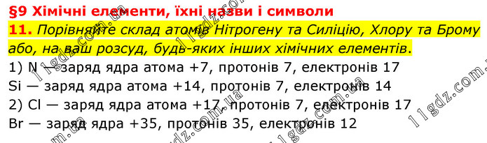 §9 Хімічні елементи, їхні назви і символи 11. Порівняйте склад атомів Нітрогену та Силіцію, Хлору та Брому або, на ваш розсуд, будь-яких інших хімічних елементів. 1) N — заряд ядра атома +7, протонів 7, електронів 17 Sі — заряд ядра атома +14, протонів 7, електронів 14 2) Сl — заряд ядра атома +17, протонів 7, електронів 17 Вr — заряд ядра +35, протонів 35, електронів 12