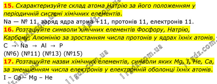 15. Схарактеризуйте склад атома Натрію за його положенням у періодичній системі хімічних елементів. Na — № 11, заряд ядра атома +11, протонів 11, електронів 11. 16. Розташуйте символи хімічних елементів Фосфору, Натрію, Карбону, Алюмінію за зростанням числа протонів у ядрах їхніх атомів. C → Na → Al → P (№6) (№11) (№13) (№15) 17. Розташуйте назви хімічних елементів, символи яких Mg, I, He, Ca, за зменшенням числа електронів у електронній оболонці їхніх атомів. I – Ca – Mg – He