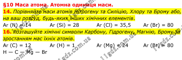 §10 Маса атома. Атомна одиниця маси. 14. Порівняйте маси атомів Нітрогену та Силіцію, Хлору та Брому або, на ваш розсуд, будь-яких інших хімічних елементів. Аr (N) = 14 Аr (Sі) = 28 Аr (Сl) = 35,5 Аr (Вr) = 80 16. Розташуйте хімічні символи Карбону, Гідрогену, Магнію, Брому за зростанням мас їхніх атомів. Аr (С) = 12 Аr (Н) = 1 Аr (Мg) = 24 Аr (Вr) = 80 Н — С — Мg — Вr