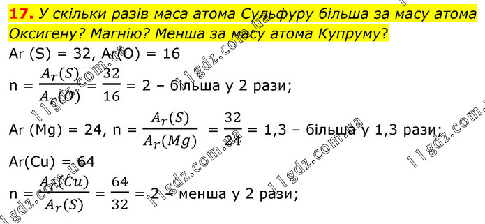 17. У скільки разів маса атома Сульфуру більша за масу атома Оксигену? Магнію? Менша за масу атома Купруму? Ar (S) = 32, Ar(O) = 16 n = (A_r (S))/(A_r (O)) = 32/16 = 2 – більша у 2 рази; Ar (Mg) = 24, n = (A_r (S))/(A_r (Mg)) = 32/24 = 1,3 – більша у 1,3 рази; Ar(Cu) = 64 n = (A_r (Cu))/(A_r (S)) = 64/32 = 2 – менша у 2 рази;