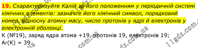 19. Схарактеризуйте Калій за його положенням у періодичній системі хімічних елементів: зазначте його хімічний символ, порядковий номер, відносну атомну масу, число протонів у ядрі й електронів у електронній оболонці. К (№19), заряд ядра атома +19, протонів 19, електронів 19; Ar(К) = 39