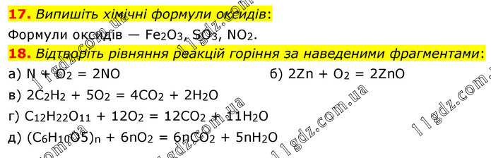 17. Випишіть хімічні формули оксидів: Формули оксидів — Fе2O3, SО3, NO2. 18. Відтворіть рівняння реакцій горіння за наведеними фрагментами: а) N + O2 = 2NO б) 2Zn + O2 = 2ZnO в) 2С2Н2 + 5O2 = 4СO2 + 2Н2O г) С12Н22О11 + 12O2 = 12СO2 + 11Н2O д) (С6Н10О5)n + 6nO2 = 6nСO2 + 5nН2O