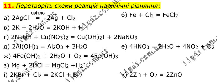11. Перетворіть схеми реакцій на хімічні рівняння: а) 2АgСl =(світло) 2Ag + Cl2 б) Fе + Сl2 = FеСl2 в) 2К + 2Н2O = 2КОН + Н2↑ г) 2NaОН + Сu(NO3)2 = Сu(OН)2↓ + 2NаNO3 д) 2Аl(ОН)3 = Аl2O3 + ЗН2O е) 4HNO3 = 2Н2О + 4NO2 + O2 ж) 4Fе(OН)2 + 2Н2O + O2 = 4Fе(OН)3 з) Mg + 2НСl = MgСl2 +Н2↑ і) 2КВr + Сl2 = 2КСl + Вr2 к) 2Zn + O2 = 2ZnО