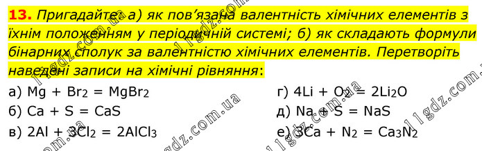 Пригадайте: а) як пов’язана валентність хімічних елементів з їхнім положенням у періодичній системі; б) як складають формули бінарних сполук за валентністю хімічних елементів. Перетворіть наведені записи на хімічні рівняння: а) Мg + Вr2 = MgBr2 б) Са + S = СаS в) 2Аl + ЗСl2 = 2АlСl3 г) 4Lі + O2 = 2Li2O д) Na + S = NaS е) ЗСа + N2 = Са3N2