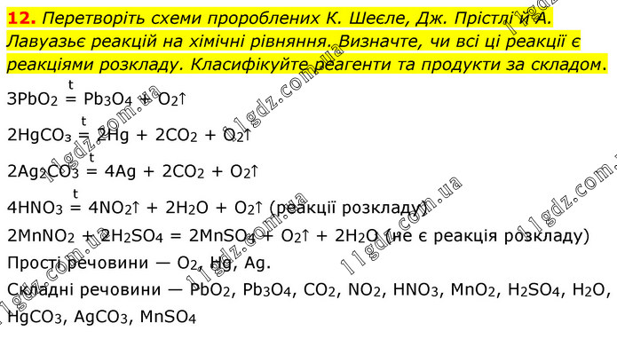 12. Перетворіть схеми пророблених К. Шеєле, Дж. Прістлі й А. Лавуазьє реакцій на хімічні рівняння. Визначте, чи всі ці реакції є реакціями розкладу. Класифікуйте реагенти та продукти за складом. ЗРbO2 =(t) Рb3O4 + O2↑ 2HgCOз =(t) 2Hg + 2СO2 + O2↑ 2Аg2СO3 =(t) 4Аg + 2СO2 + O2↑ 4НNO3 =(t) 4NO2↑ + 2Н2O + O2↑ (реакції розкладу) 2МnNO2 + 2Н2SO4 = 2МnSO4 + O2↑ + 2Н2O (не є реакція розкладу) Прості речовини — O2, Нg, Ag. Складні речовини — РbO2, Рb3O4, СO2, NO2, НNО3, МnO2, Н2SO4, Н2O, НgСO3, АgСO3, МnSO4